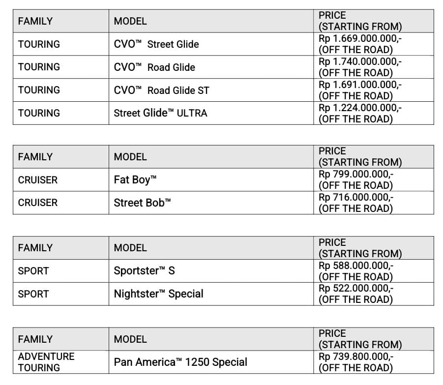 Sebagai strategi untuk menjangkau pasar lebih luas, Harley-Davidson® juga mengumumkan penyesuaian harga untuk model bermesin Revolution™ Max, termasuk Sportster™ S, Nightster™ Special, dan Pan America™ 1250 Special. Langkah ini dinilai tepat dalam merespons kebutuhan pasar lokal yang semakin menghargai efisiensi dan teknologi tinggi. Dengan harga yang lebih kompetitif, generasi baru pengendara kini memiliki akses lebih mudah terhadap motor berperforma tinggi khas Harley-Davidson®.