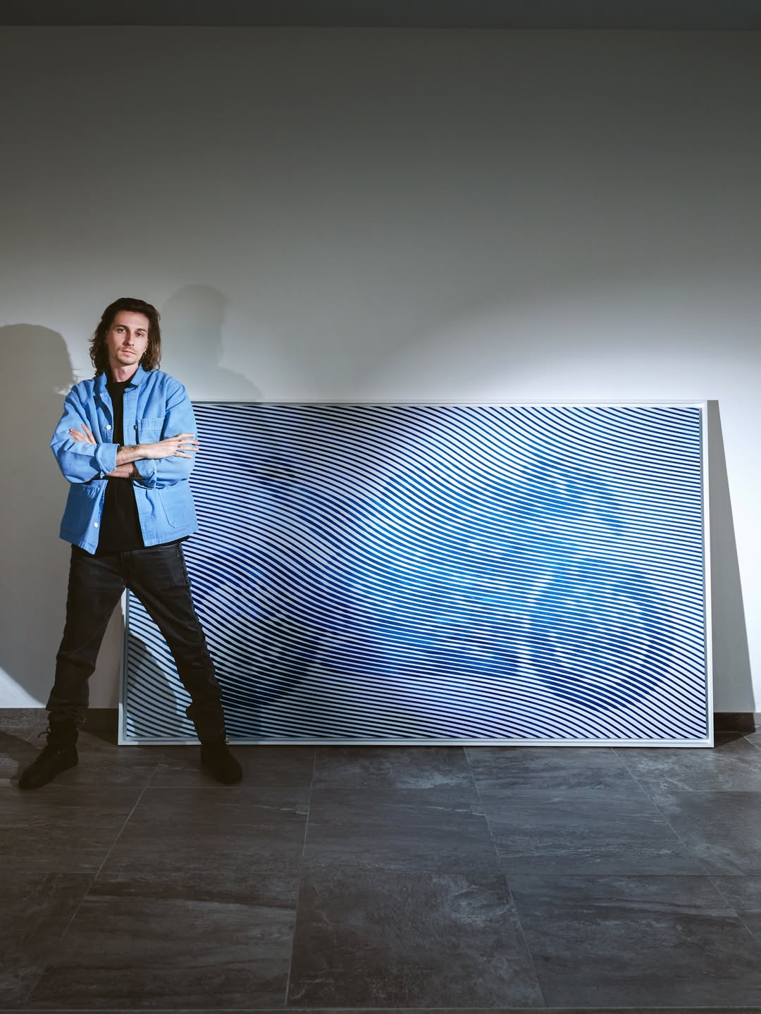Di atas kanvas berskala 1:1, garis-garis biru mengalir lembut dan konsisten, menciptakan ilusi optik seolah motor tersebut sedang melaju di depan mata. Tiap garis tidak saling bersinggungan, memberi kesan elegan sekaligus menegangkan—seperti melihat kecepatan dalam bentuk yang paling artistik. Efek visual ini menjadi jembatan antara dunia balap dan dunia galeri seni.