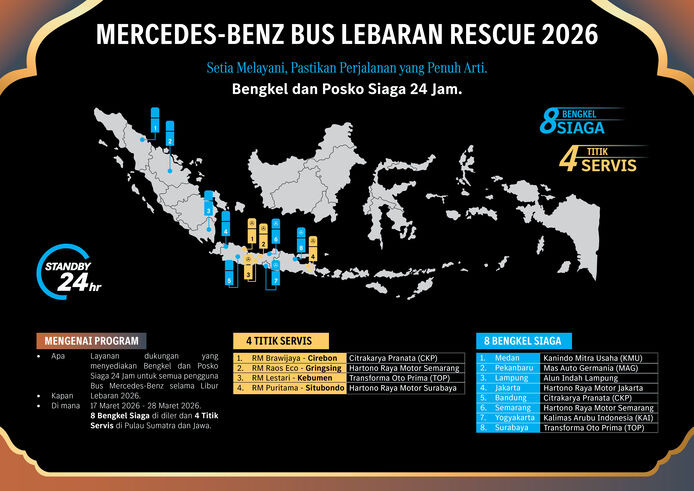 Program ini resmi dijalankan pada 17 hingga 28 Maret 2026 dengan menghadirkan total 12 titik layanan strategis di berbagai jalur utama transportasi Indonesia. Terdiri dari delapan bengkel siaga dan empat service point, inisiatif ini dirancang untuk memastikan setiap armada bus Mercedes-Benz tetap beroperasi optimal selama periode krusial tersebut.